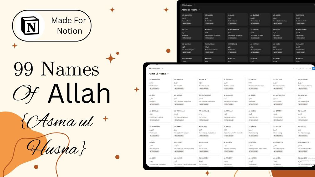 Discover the beauty of Allah's 99 names through a comprehensive Notion template. This checklist presents each name in Arabic and its English meaning, with its use in Dua And its benefits.